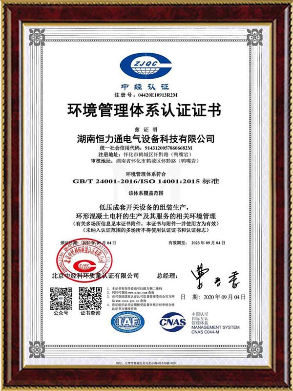 ISO14001环境管理体系认证证书
