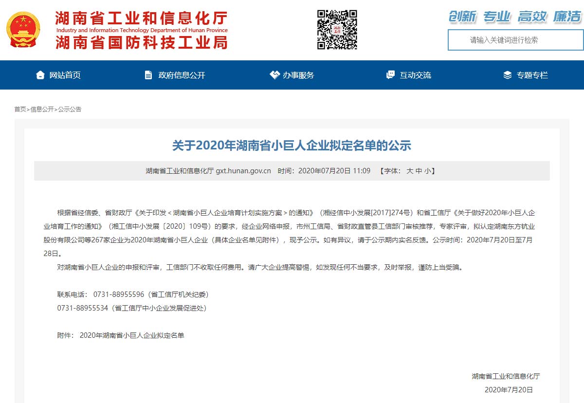 根据省经信委、省财政厅《关于印发<湖南省小巨人企业培育计划实施方案>的通知》(湘经信中小发展[2017]274号)和省工信厅《关于做好2020年小巨人企业培育工作的通知》(湘工信中小发展〔2020〕109号)的要求,经企业网络申报,市州工信局、省财政直管县工信部门审核推荐,专家评审,拟认定湖南东方钪业股份有限公司等267家企业为2020年湖南省小巨人企业(具体企业名单见附件),现予公示。如有异议,请于公示期内实名反馈。公示时间:2020年7月20日至7月28日。